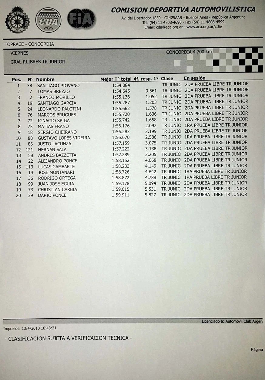 En un doblete cordobés, Tomás Brezzo y Santiago Piovano lideraron la primera y segunda prueba libre respectivamente en el arranque de la tercera fecha del TopRace Junior en el circuito entrerriano. No obstante, Piovano se quedó con el mejor tiempo de la General al cabo del día.